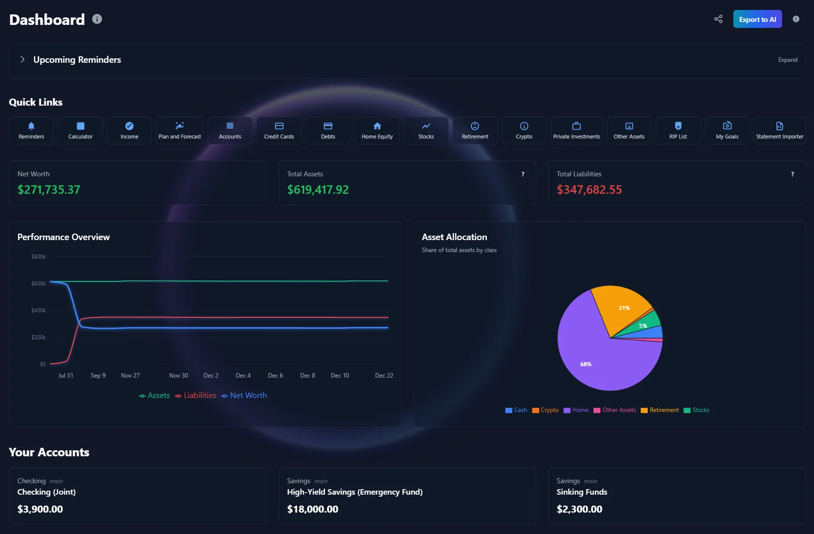 - Everything that makes up your financial life: bank accounts, brokerage holdings, cryptocurrency, real estate equity, credit cards, loans, retirement accounts, savings goals, and non-liquid assets like cars or collectibles. It all rolls up into a single net worth dashboard.